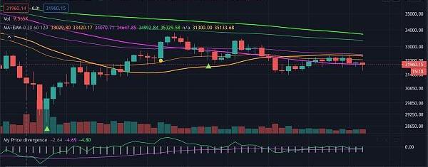 1900/1/1 0:00:00行情分析: 比特幣在昨天收陰后,今天并沒有走出下跌延續,反彈33100一線受阻回落,整體波幅相較昨天收縮不少.