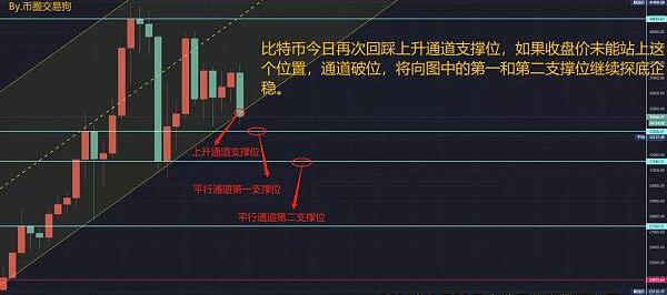 第二種:今日或者明天,收盤價位于上升通道的下軌以下區域,通道重寫,圖中的兩大支撐位就將成為新的企穩點,第一支撐位是33506,第二支撐位是31580,按平行通道的運行規律,通常在第二支撐位附近企穩更加理性。