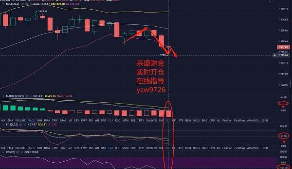 布林帶呈現張口狀態運行。晚間空頭已經掌控全局。MACD快慢線向下運行。紅色動能持續放量。KDJ三線向下發散運行,CCI線在超賣區運行