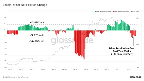 礦工持倉凈額變化指標顯示了礦工未使用的供應30天的變化率。這表明在過去的兩周里,分發量明顯增加,通常與哈希率的整體下降相吻合。在過去的兩周里,礦工們以每月約4千到5千的速度凈分發。這已經扭轉了自4月以來凈積累的趨勢。