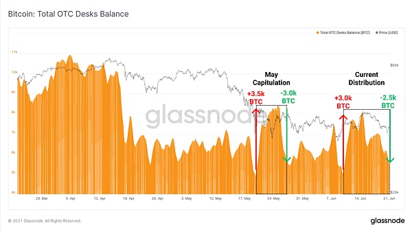 在5月拋售期間和過去兩周,觀測到有3.0萬至3.5萬個比特幣的凈流入。然而,在這兩種情況下,幾乎所有的流入規模都在短短幾周內被買家吸納了。總的來說,自4月以來,我們監測的場外交易市場柜臺上的比特幣總持有量一直保持相對的平穩。