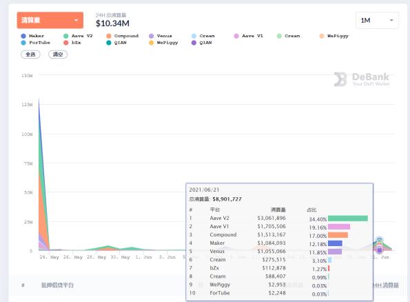 DeFi市場的借貸應用也隨著行情下跌再一次迎來大規模清算。根據DeBank數據,6月21日排名前十的DeFi借貸應用總清算量超過890萬美元,創造6月以來新高。