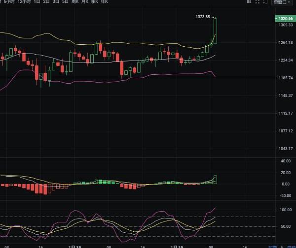 行情分析:以太上行至1240位置后承壓回落,目前價格運行在1234附近4小時級別上看,價格測試布林上軌的壓制力度,價格有上行的意圖,日內的多頭強勢,已將早間的跌幅收復,價格低點也在不斷上移,整體多頭占優?目前新高1323附近?白盤操作建議低多為主