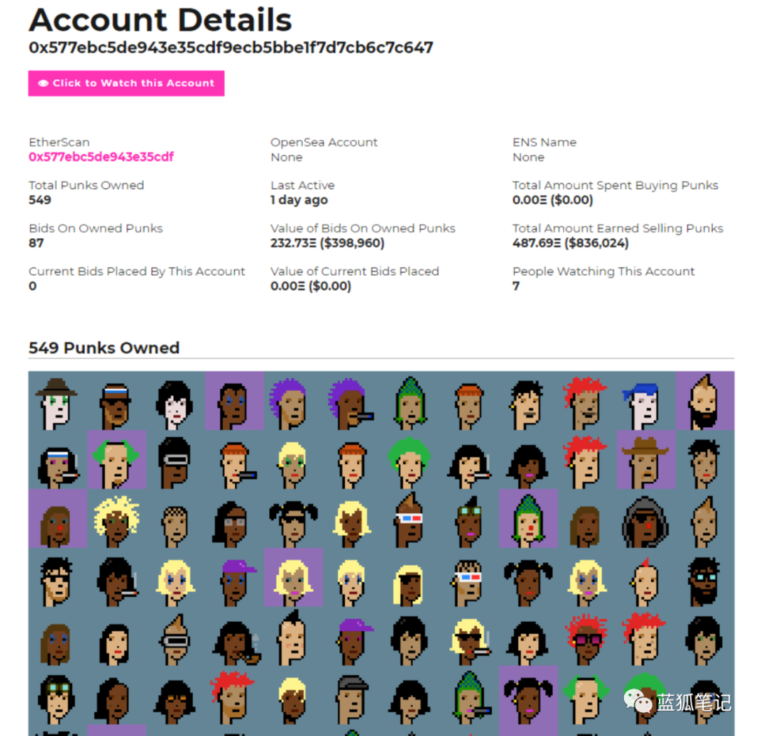 截止到藍狐筆記寫稿時,Mr.703持有269個CryptoPunks的NFT,TA迄今為止賺取了6910個ETH,總價值達到1615萬美元。此外,TA不僅售出,也買入Punks,到截稿時TA買入花費了569.61ETH,價值133萬美元。