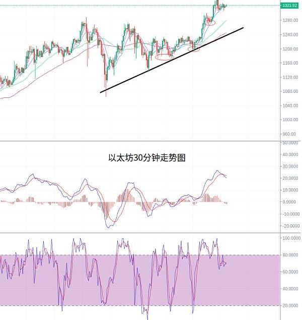 以太坊作為補漲幣中的領頭羊,目前也是正朝著我之前提到的思路來走。距離18年初高點1400也差不多快到了,這樣的行情其實也同樣沒什么好分析的,牛市中的市值占比就是很好的風向標,大家可以多關注下,看看最近哪些幣種市值處于增長狀態,能夠從比特幣口中搶資金流就說明后市還有上升潛力!現在的行情走勢規律基本上就是前期的比特幣走勢,不斷回調后拉升破新高,那操作思路也是同樣的,拉升不追看回調然后看延續,操作思路非常簡單,震蕩上漲中多注意洗盤調整就好,波段支撐關注1240以及1140-1170區域位置,至于短線做空區關注早間高點1340以及1400關口即可,行情波動活躍,波段操作結合這些支撐壓力位置進場的時候注意分倉和利潤空間把握!