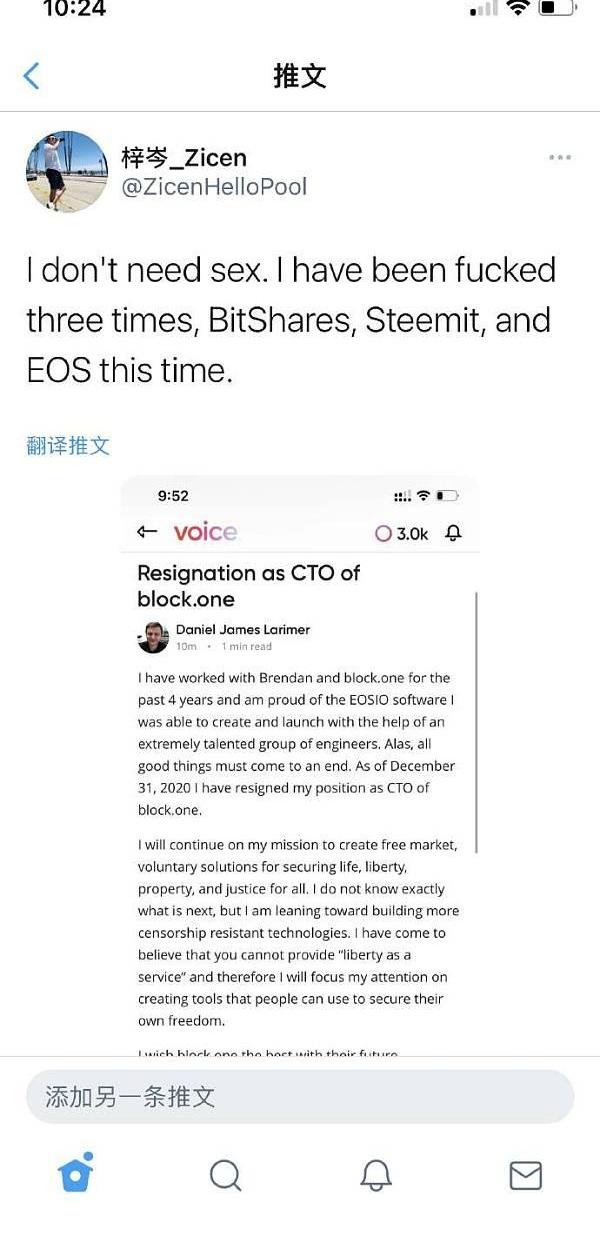 “截至2020年12月31日,我辭去了Block.one首席技術官一職。我將繼續致力于創建自由市場、自愿解決方案,以確保所有人的生命、自由、財產和正義。我不知道下一步到底是什么,但我傾向于構建更多的抗審查技術,我將集中精力于創建人們可以用來確保自己的自由的工具。”