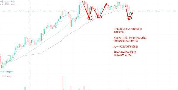 39300-39650低多進場,目前是短暫走弱后的修復期。跟進拿好。目標回歸正常盤整區41200-41400.破位持有