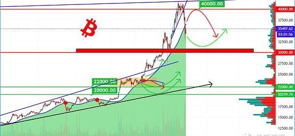 比特幣昨天的價格在40000上方沒有沖破結構線完成新高突破,從前兩天的盤面情況中可以看出買盤已經不足了,之前屬于高位風險區域做突破單而不是回調單,是相對來說比較安全的。昨晚價格在回到40000點下方之后大幅度下跌,在今天早上又開始續跌,樹倒猢猻散,一大堆的主流幣和山寨幣也跟隨比特幣行情開啟了瀑布式下跌,鑒于此輪牛市的走法是parabolic,所以大幅度的下跌配合大量供應出現對于牛市來說,是極其危險的信號,當日的下跌已經將近10000點的幅度,24小時爆倉近15億美金,多頭力量和持倉信心遭到嚴重打擊,再次突破新高大幅度拉漲,短期概率較小,但從目前的資金承接力量來看,有機會二測高點,不過需要一些時間來完成震蕩吸籌和構建派發支撐。
