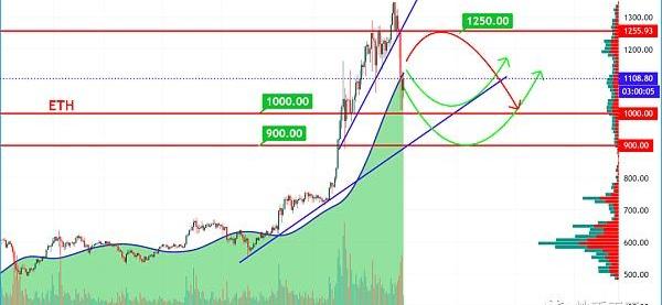 ETH跟隨比特幣垂直下跌,目前突破新高的概率已經大大的減小了,1000整數位價格暫時提供支撐,但是如果比特幣持續下跌的話,那么大概率還是要在下方尋找支撐位的,現在只能以比特幣大級別周期為主要的止跌信號。日線跌幅已經將近30%,如果跌破1000的話,支撐位在900附近。上方的密集成交區上行有壓力,不過走勢上來說,強度和比特幣差不多。
