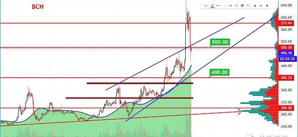 BCH一根日線大陰直接將前兩天的上漲幅度盡數收回,目前能看到支撐位在450價格左右,這個位置是之前的密集成交區,具有一定的支撐作用,還是以現貨為主的承接方式,大陰線出來,肯定會引起場內的多頭恐慌,所以是否有足夠的資金來在支撐位承接還無法確定,合約開倉點在400價格上方附近。