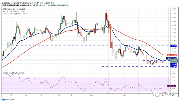 多頭正試圖將DOT推到上方阻力位16.93美元和20天EMA(17.07美元)之上。如果他們成功了,DOT可能會上漲至50天SMA(20.43美元),在那里空頭可能會再次發起激烈的抵抗。