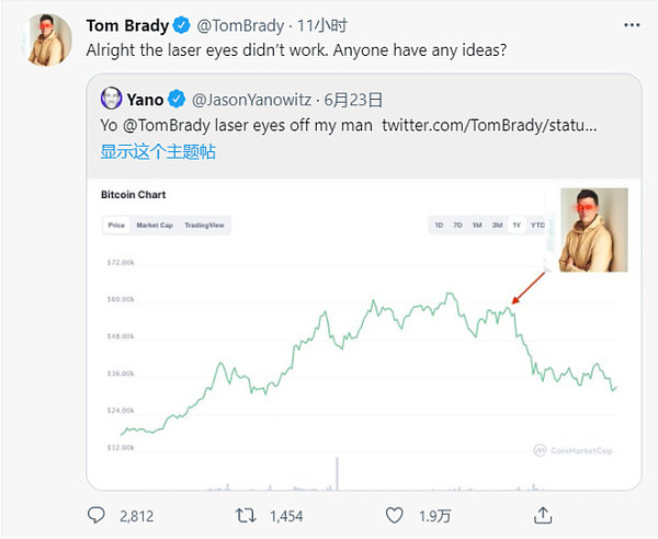 美國國家橄欖球聯盟(NFL)巨星湯姆·布雷迪(Tom Brady)周一在推特上表示:“好吧,激光睛沒起作用。”布雷迪在5月初更改了他的推特個人資料照片,加入了“激光眼”活動。根據Coin Metrics的數據,比特幣的價格從布雷迪更換頭像時的56,245美元已下跌了近40%。據悉,“激光眼”是在推特興起的一種比特幣宣傳潮流,此前,特斯拉CEO Elon Musk、CoinShares CEO Meltem Demirors、Blockstream CSO Samson Mow 等人都(曾)參與到本次活動中。