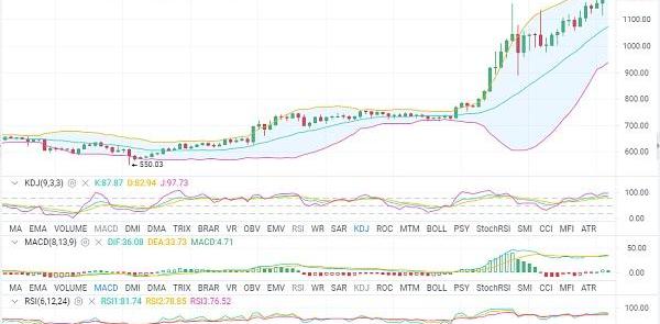 以太坊日線級別昨日大陽收尾,日內價格延續上揚,目前價格不斷刷新高點,站上1200上方,目前價格運行于1216位置,且有進一步上行的可能。日內來說還是關注1200位置的得失,目前以太新高突破高點1220附近,短期行情依然高位震蕩,小周期布林帶張口向上運行,KDJ多頭向上發散,MACD紅色能量柱逐步放量,短期多頭依然明顯,順勢多。關注支撐:1163-1145-1110?