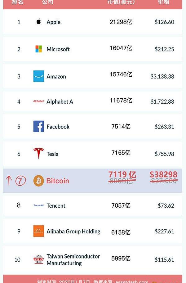 BTC價格也超越了1輛特斯拉價格,流通市值更是超越騰訊,距離全球排名第6位的Tesla只有一步之遙。