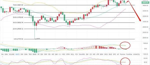 34500-34550附近高位空單進場,目標點位34380-34260,破位看34020,止損點位34750