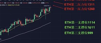 ETH價格繼續上漲,再創階段新高,最高1220,最低1057,震幅14.%,收盤漲9.9%,光頭大陽線報收,4小時和日K線均呈多關排列,高位強勢突破行情。