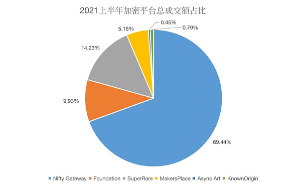 并且Nifty Gateway的成交額占了上半年幾乎整個加密藝術銷售額的70%,可以說是目前加密藝術領域的龍頭平臺。排名第二的是SuperRare,將近7千萬的成交額,占了將近14%的比例。