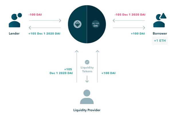 實現形式如下:借款方如果想借出DAI,需要抵押ETH,系統自動鑄成yfDAI(這一步在用戶界面上不會出現),并將yfDAI兌換成DAI給到放貸方。這里yfDAI的利率會根據市場價格上下浮動。其中yfDAI和DAI的折價就是借款方所要支付的利息。放貸方則可以存入 DAI 來折價獲得 yfDAI,折價部分就是到期收益率。放貸方購買時可以選擇不同的期限,不同的期限收益率不同。到期之后可以使用 yfDAI 1:1 兌回 DAI。流程可以簡化成以下: