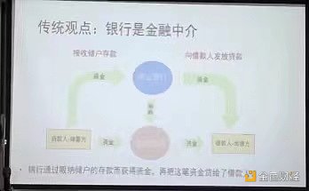 這是傳統對于銀行的理解,銀行是金融中介。銀行是把已經存在的資金拿回來再借給其他人,通過轉手向借貸方來借貸。