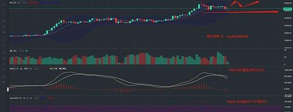 四小時級別看:幣價在創新高之后,不斷往下回調,連續跌破五日十日和中軌位置支撐,目前五日和十日均線不斷向下,空頭強烈,而附圖指標;MACD快慢線死叉運行,紅色動能持續放量,StochRSI指標向下而行,盤中整體趨勢指向空頭,目前幣價在觸底之后迅速反彈,午間操作上建議低點位做多為,本人還是認為看好多頭的。
