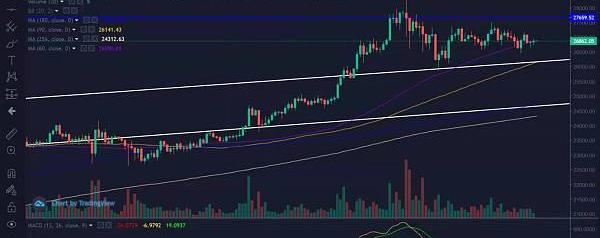 比特幣這兩天的走勢一直是以震蕩為主,在經歷了前高以后,四小時級別在前高的位置形成一個十字星,這個十字星的成交量可以說是非常的大,上方的壓力可以看十字星的收盤27650一線的強力壓制,小時級別的MACD在0軸附近粘合運行,新的方向將會打開,下方的支撐位于26100一線,也是小時級別MA90的位置,所以日內持續關注區間26100-27650。高拋低吸,破位去追