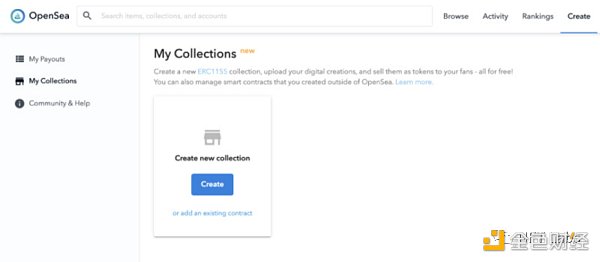 OpenSea 平臺也支持 NFT 創建,而且完全免費,用戶不需支付手續費來部署智能合約。點擊網站右上角的“Create”就可以開始創造了。