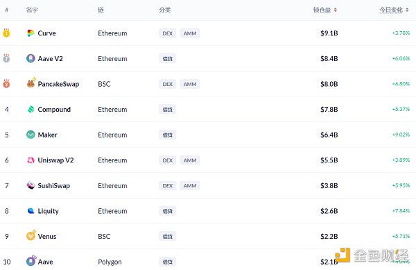 DeFi項目鎖定資產前十排名及鎖倉量,數據來源:Debank