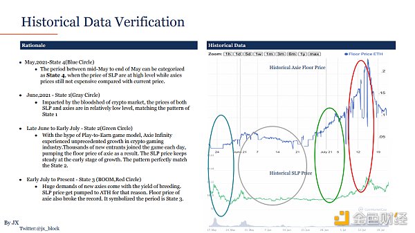 2021年7月初到現在--狀態3(爆發,紅圈)。:在對axie巨大需求的同時,繁殖產量增加,由于這個原因,SLP價格被拉高到歷史新高,axie的底價也打破記錄。它象征著進入狀態3。