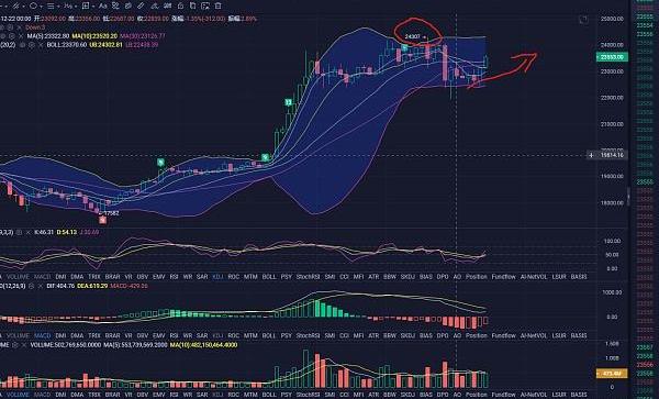 ?15分鐘圖看布林帶開口向上,K線在中軌上方運行,幣價的漲勢有誘多的假象,看24000的壓力線,KDJ三線在安全區粘連運行有下探的勢頭。可以先空倉等待行情企穩后在選擇操作方向,因為現在就是加大了震蕩節奏,進場的時機不是很好。