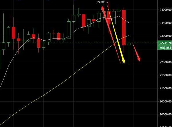 XRP/HKD-0.39%今日比特幣行情晚間再次高臺跳水,瞬間砸盤1000余點。目前幣價在22700上下反復震蕩。