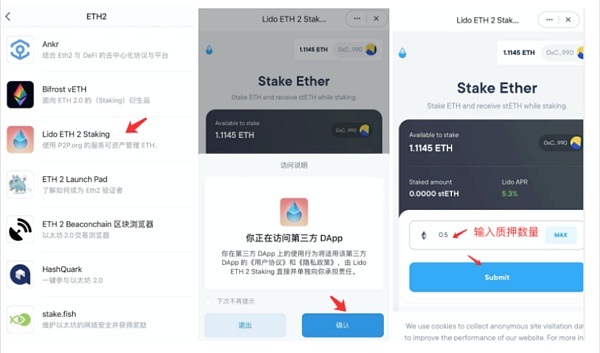 在質押區找到「Lido ETH 2 Staking」并打開,在彈出的界面中點擊?「確認」?按鈕,然后輸入想要質押的 ETH 數量,點擊?「Submit」?按鈕就可以了。