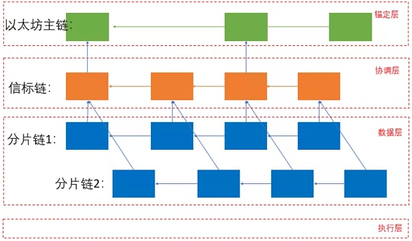 信標鏈為一條獨立的區塊鏈,它主要負責存儲和管理驗證者的注冊表,并且實現了 Eth2 的 PoS 共識機制,信標鏈只會處理協議的共識層,其數據和應用層卻是空的,信標鏈和原來的 Eth1 將會共同運行,以確保數據的連續性,即 Eth1 作為以太坊執行層,而 Eth2 的信標鏈則作為以太坊的 PoS 共識層。