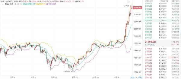 ??比特幣昨日晚間突破20000美金這個關口,迎來歷史新高,破位后上方無阻力,持續創建新高,回調力度極小,四小時和一小時圖,BOLL通道向上張口運行,指標MACD多頭能仍在放量,KDJ三線均已進入超買區發散。預計今日白盤走震蕩,以低位做多即可。