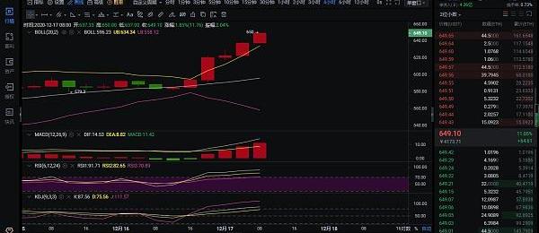四小時級別來看,昨日晚間以太觸底581一線反彈,持續震蕩上漲,K線六連陽,沿著布林上軌一路向上蔓延,脫離了布林軌道,突破了前期高點635,觸及648一線回調,仍保持在640上方,可以看出多頭非常強勢,技術上,布林軌道隨著幣價的拉升開口擴張,各均線呈多頭排列形成支撐,MACD快慢線金叉向上,多頭柱能逐步增強,KDJ,J線進入了超買區拐頭持平,三線窄幅平行進入調整,整體來看,仍處于一個多頭趨勢,目前行情高位震蕩,謹防追漲,以防幣價沖高回落的風險,日內操作上建議高空為主。