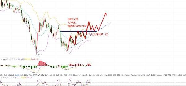 以太昨日晚間以太最低回踩551后,給到大幅反彈。昨日策略思路552附近開多,完美把握最低點位。目前以太坊從小周期來看,短期回踩修復趨勢明朗,副圖指標KDJ指標向下聚攏運行,MACD快慢線整體趨勢向上,目前紅柱動能有所縮量。短期幣價還有回踩空間,著重關注下方支撐560一線。我預計短期走勢回踩下方支撐560附近走W底形態,觸碰趨勢線支撐后給到反彈。我們日內操作以低多為主即可。