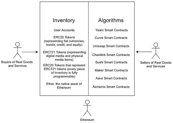 該世界計算機的目的很簡單:以最佳方式組織特定資產的買家和賣家。這些資產可以是金融資產 (就富國銀行等銀行而言)、實物可消費資產 (就亞馬遜等電子商務公司而言) 或者數字可消費資產 (就 Facebook 等媒體公司而言)。
