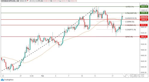 尤其是以前一輪回調行情深度作為基準來看,凌晨這波反彈還推動價格完成了對于這波回調的反抽半分位以及0.618黃金分割阻力的有效收復,雖然反彈階段高點止步于回調波段反抽0.786黃金分割阻力一線,但是正如前文所述,行情在快速反彈收復多道技術阻力之后早盤的回調力度非常有限,這咋很大程度上鞏固了短線反彈的有效性,如若行情能夠在4小時級別圖形中給出10000-9800支撐密集區域內的清晰企穩信號,那么行情有望在短時間內走出新一輪的發力上漲表現。