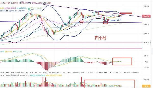 四小時看來價格的量能都是很低迷的狀態,包括我們一直關注的灰度也是休息了幾天,觀察之前的價格走勢,下方是多次破中軌支撐又回到中上軌,但是上軌線位置是一直遲遲未突破的,并且高點在降低,所以我們目前需要關注上軌線610的壓力