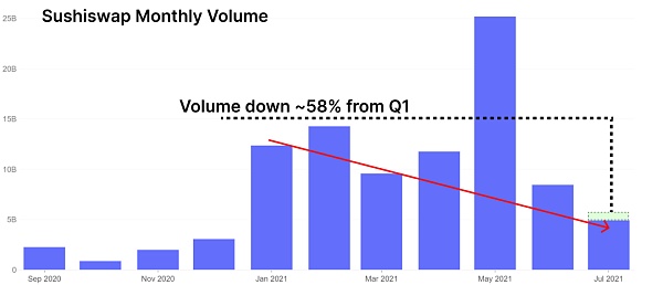 相對于第一季度的表現,月度 Sushiswap 交易量已經大幅下降,預計 7 月的交易量徘徊在50億美元左右,相對于今年第一季度的平均 86億美元下降了約 58%。