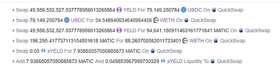 最后攻擊者利用QuickSwap將所有的YELD代幣兌換成USDC、WETH和MATIC套現離場。