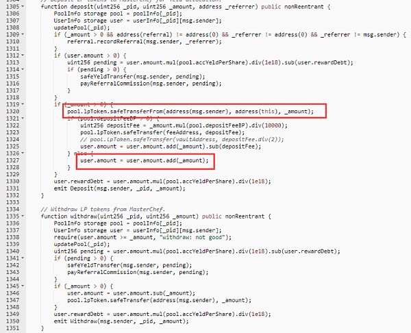 MasterChef類型抵押池設計之時,還沒有通縮通脹類代幣的出現,故開發者并沒有考慮這類代幣可能會造成的影響。部分的項目方在進行代碼開發時,直接使用了舊的MasterChef代碼,并添加了通縮通脹類代幣或者獎勵作為抵押代幣,這便導致了各種惡意攻擊事件或異常情況的產生。就目前來看,MasterChef類型抵押池存在兩種類型的問題:一是沒有對通脹通縮類代幣進行特殊處理,沒有檢查實際轉移到合約中的代幣數量是否與函數調用時填寫的數量相同;二是添加了獎勵代幣作為抵押代幣,導致獎勵計算出現異常。