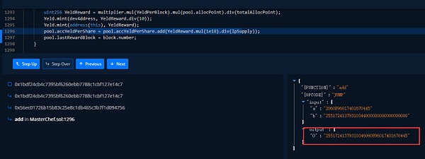 接下來,攻擊者通過攻擊合約在一筆交易反復調用MasterChef合約中的抵押提取函數將MasterChef中PID為16的抵押池中的xYELD代幣數量減少0到最小值。