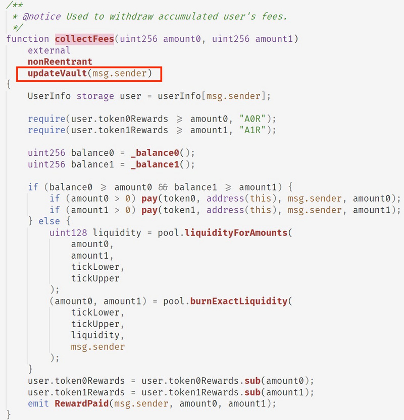 最后,會將記錄在 userInfo 中的 Rewards 狀態進行更新。看到這里,機槍池的代碼實現還是比較符合邏輯的。但是在函數開頭我們發現了 updateVault modifier,這個函數會在 collectFees 的函數體之前運行,漏洞也許在 updateVault 相關的函數中。