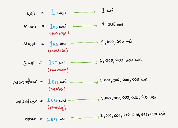 - 以太坊中的價值通常都以 wei 為單位。wei 是以太坊區塊鏈上最小的價值單位,是 ETH 的 1/10^18。Gas Price 則通常以 giga wei(縮寫為 Gwei)為單位。Gas Price 在以太坊網絡上是個復雜的問題,因為它經常會浮動。EIP-1559?是一個最近通過的網絡變更,可能會在今年底推出,可能會緩解 Gas Price 的劇烈波動。除了 wei 和 Gwei,還有其它用于表示價值的單位。要了解這些單位,請訪問?eth-converter.com?-