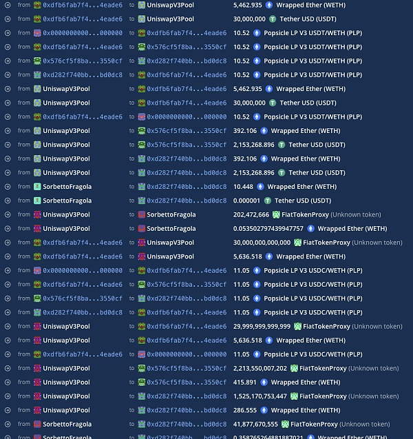 通過分析此交易我們可以發現,其先從 AAVE 中利用閃電貸借出了 30,000,000 個 USDT、13,000 個 WETH、1,400 個 WBTC、30,000,000 個 USDC、3,000,000 個 DAI、200,000 個 UNI,為后續在 Sorbetto Fragola 中提供流動性獲得 PLP 憑證做準備。