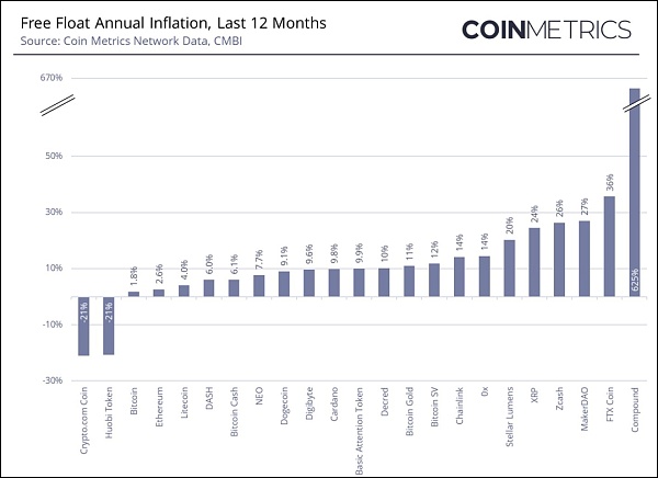 去年,自由流通年膨脹率最高的加密資產(以幣本位計價)依次是Compound(625%)、FTX Coin(36%)、MakerDAO(27%)、Zcash(26%)和XRP(24%)。同期,Crypto.com Coin(-21%)、Huobi Token(-18%)和Bitcoin(1.8%)的年通貨膨脹率最低。