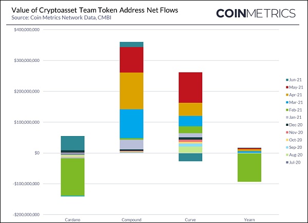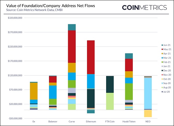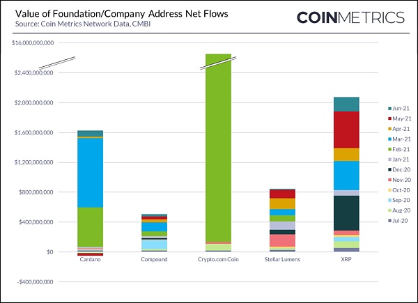 2021年第二季度期間,轉移到確定的基金會和公司控制地址之外的加密資產凈值為35億美元,低于上一季度的171億美元。