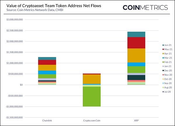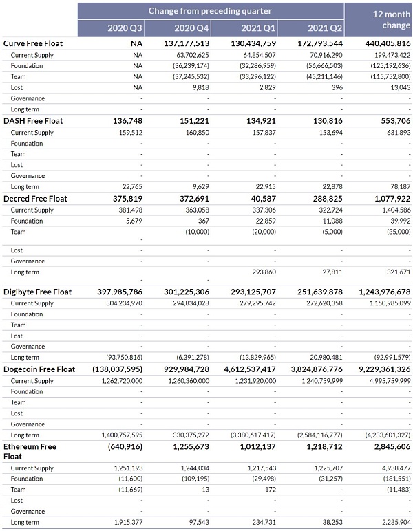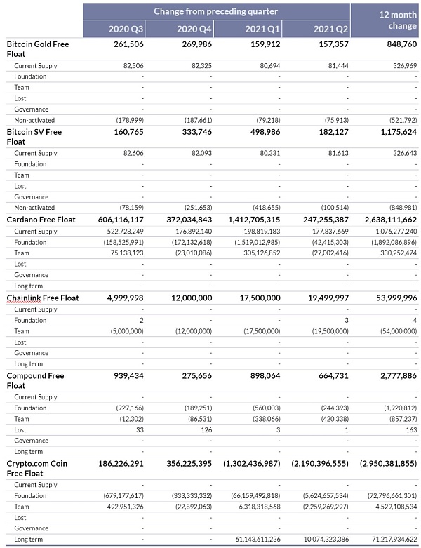 2021年第二季度,轉移到公司團隊控制地址之外的加密資產凈值大幅增加,最高達到了30億美元。2021年第二季度期間,團隊控制地址的資產增加自由流通供應最多的如下: