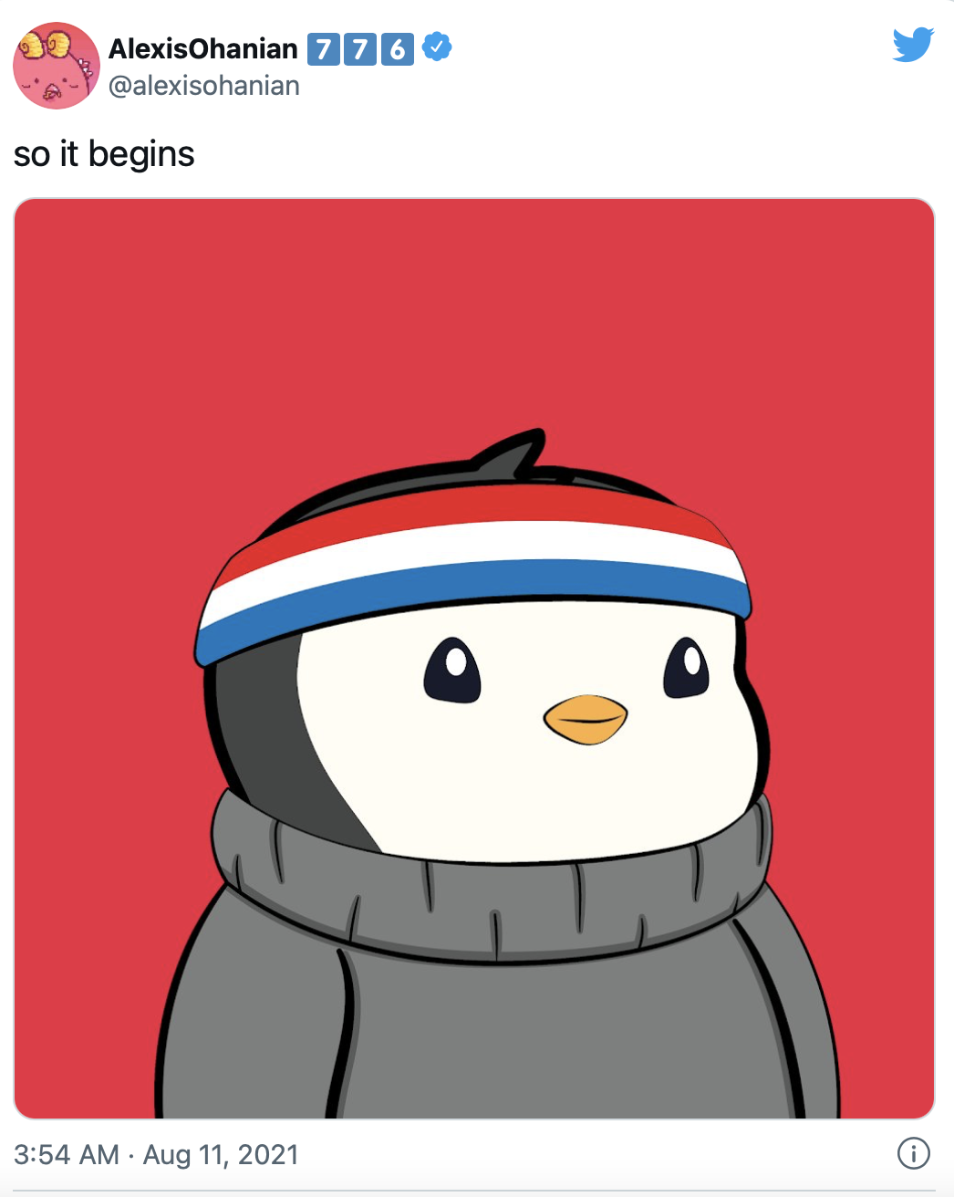 但就像那些套裝一樣,它們像熱蛋糕一樣暢銷。 Pudgy Penguins最初的發售很快售罄,NFT作品大約在三周前已全部鑄造,但就在過去幾天,它們在 Twitter 上的曝光爆炸式增長。 當 Reddit 聯合創始人兼著名投資者亞歷克西斯·奧哈尼安 (Alexis Ohanian) 周二在推特上發布了他持有的Pudgy Penguins時,似乎證實了這場收藏品熱潮正在燃燒。 《紐約時報》今天報道的關于他們的故事再次鞏固了這一點。