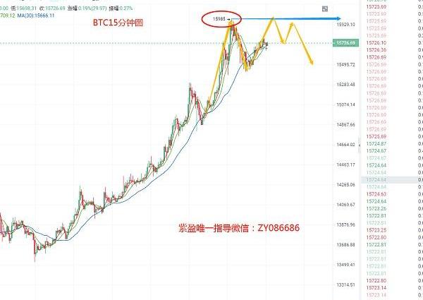 比特幣15分鐘級別看,幣價拉升至15900壓力時,很大概率可能會陷入震蕩走勢,或者面臨回調的可能性,也不排除會進一步上攻的可能,這只是預測,知識短期就拉升創新高的概率較小。紫盈預計今日后市震蕩概率較大,下面紫盈個人觀點是15分鐘若是出現雙腳形態,我們可以考慮高空對待。